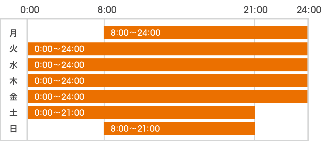 ・月曜日 0:15~8:00 ・土曜日 21:00~23:50 ・日曜日 0:15~8:00、21:00~23:50